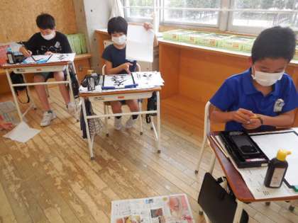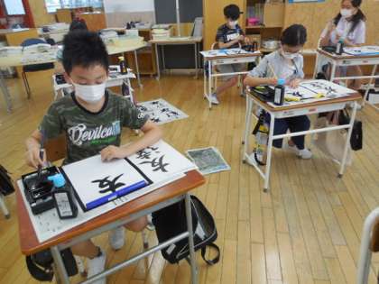 今日の習字は「友達」です。画数が多く、部分の組み合わせが難しいため、子供たちはやや苦戦していましたが、友達のことを思いながら心を込めて取り組みました。