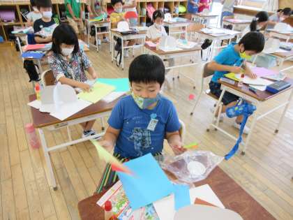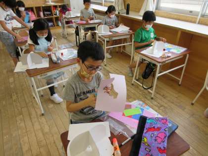 図画工作科では、割りピンを使って重ねた紙を回す仕組みを作りました。