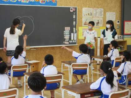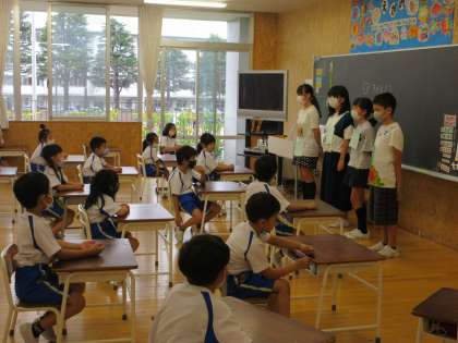 朝の時間に6年生が教室に来て、一緒に遊んでいます。