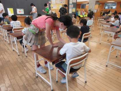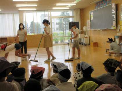 今週は、そうじや登校後の活動をお手伝いする交流に加えて、朝の会の後に遊びや読み聞かせをしています。子供たちは、「1年生に喜んでもらいたい!」という気持ちで、一生懸命準備しています。1年生の笑顔を見て、6年生も温かい気持ちになったようです。