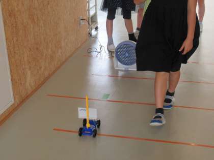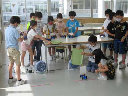 理科では、風の力で動く車を使って実験をしています。車の進む距離は、風の強さや風を受ける帆の大きさや位置とどんな関係があるのかを確かめています。実験を基に、遠くまで走るには、どんな工夫が必要か真剣に考えています。予想を立てたり、結果を表にまとめたりする理科の学習の進め方にも慣れてきています。