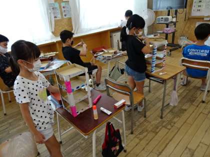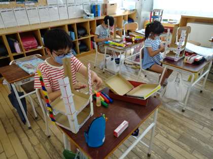 4年生は、迷路を作ってビー玉を転がす「コロコロガーレ」に取り組んでいます。台紙と柱ができたので、組み立ててみました。4段のタワーができあがって、どんな迷路を作ろうかとわくわくしている様子でした。