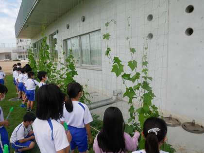 ヘチマがぐんぐん成長しています。子供たちはじっくり観察し、つるが伸びていることや、葉の大きさのこと、触ってみた感じのことなど様々なことに気付きました。これからの成長を楽しみにしています。
