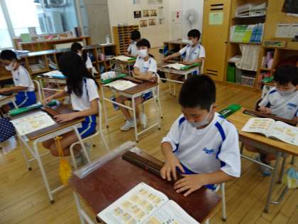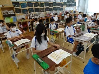 算数科で、そろばんの学習に取り組みました。そろばんで、小数を表して、計算する方法を学びました。3年生の時の学習を思い出しながら、楽しく学習しました。