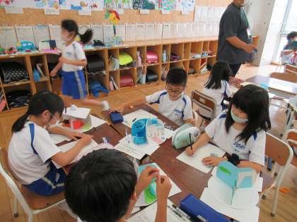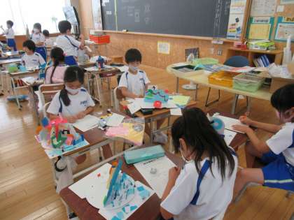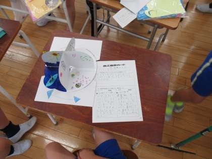 図画工作科で作った「くるくるランド」の作品を鑑賞しました。場面ごとに変わる世界を楽しみながら見合っています。お友達の材料の使い方や表現の工夫をたくさん見つけることができました。