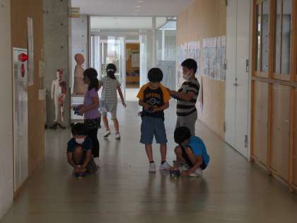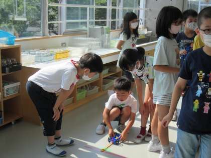 理科ではゴムで動く車を使って、ゴムのはたらきについて学習しています。学んだことを生かして「ゴールインゲーム」を楽しみました。