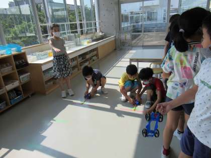 車を8mから10mの間のゴールに止めようとゴムを伸ばす長さや本数を調節します。狙った範囲に止まらなかったら、その原因を真剣に考える姿、思い通りに止まったら、友達と一緒に喜ぶ姿がたくさん見られました。