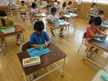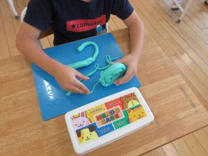 ねんどを丸めたり、ひも状にのばしたりしながら、どんなものができるか試しました。子どもたちは、何ができるか楽しんでつくっていました。