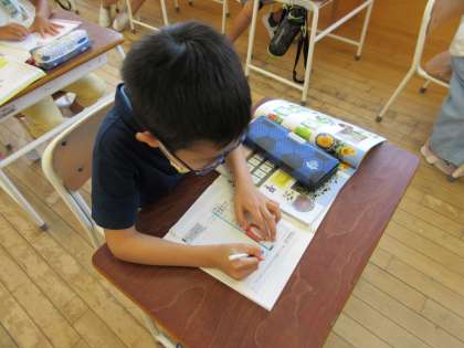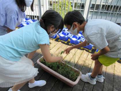 春から育ててきた植物の実ができました。どんな実ができたのか、種はどんな形なのかなど、よく観察してカードに表していました。実の中に種がある様子を見て、歓声を上げる子供たちでした。