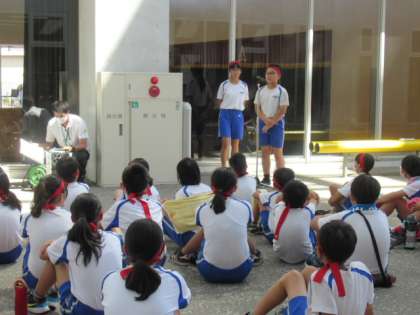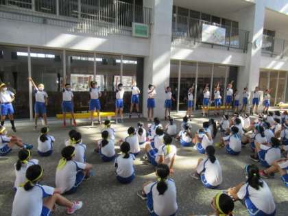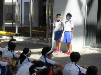 チャレンジ陸上校内記録会を行いました。開会式は、各団の団長・副団長が運営を行いました。スローガン「本気でチャレンジ!輝け!芝園っ子」に向けて、一人一人が頑張って練習してきた成果を発揮しようと、気合いに満ちた表情でした。