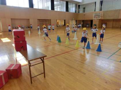 的に向かってボールを投げて、落とした的の数を競います。投げ方について話し合い、上手な友達の投げ方をまねたり、繰り返しボールを投げたりするうちに、投げ方が上達しました。