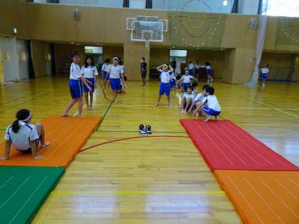 マット運動の学習の様子です。前転や後転等、基礎的な動きを中心に練習しました。