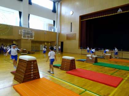 とび箱の学習の様子です。手をつく位置、目線等に気を付け、開脚とびの練習をしました。