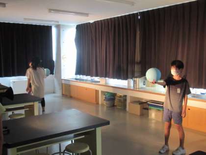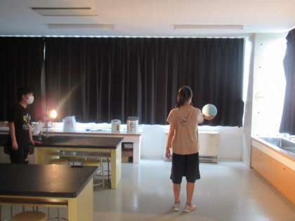 理科で「月の形と太陽」について学習しています。今日はボールに光を当てて、月の形の見え方を調べました。実験から月の形が日によって変わって見えるのはどうしてか考えました。
