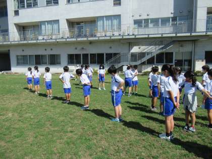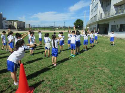 理科「太陽とかげを調べよう」の学習をしています。今日は晴れていたので、かげをつないでトーテムポールをつくりました。かげをなるべく長くつなげようとグループで協力しています。かげができる向きが同じことに気がつき、素早く列をつくる子供たち。体験を通して、子供たちの気づきやふしぎの種を大切に学習を進めていきます。