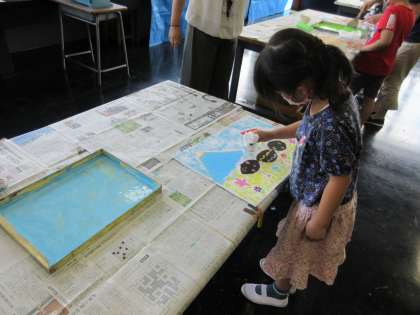 図画工作科の学習で、「虫と一緒に○○へ出かけてみたい」と考えながら絵を描いています。今日は、絵の背景の部分にタンポで色をつけました。ポンポンときれいに色づく様子を見て楽しんで活動しました。