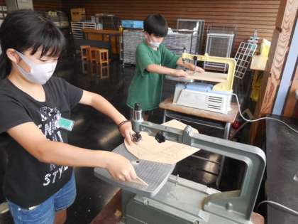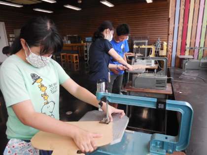 電動糸のこぎりを使って、思い思いの形に板を切っています。この後、色を塗ってホワイトボード板に仕上げていきます。