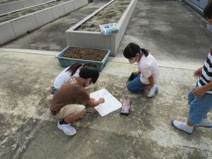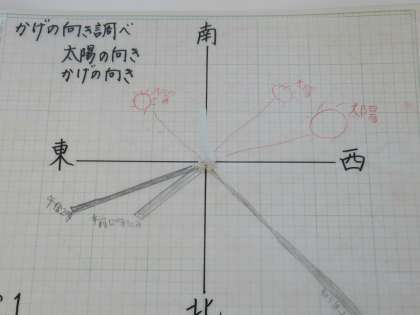 太陽の動きとかげの関係を調べるために、屋上で1日の太陽の位置とかげのでき方を記録しました。記録した結果からわかることを話し合い、太陽とかげについて理解を深めました。かげができるしくみを知った子供から「かげふみ鬼でつかまらないコツをみつけたよ」「今度は朝早く、かげでトーテムポールつくろう」とつぶやく声が聞こえてきました。子供らしい発想で、学びを遊びに生かそうとする姿が微笑ましいです。