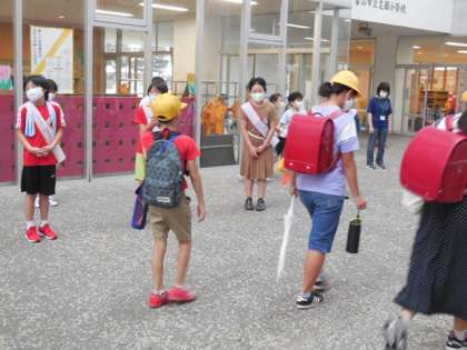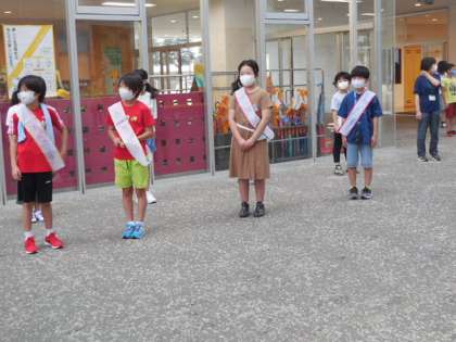 今日は5年生の代表6名が、計画委員会企画の挨拶運動に参加しました。肩からたすきをかけ、元気よく挨拶をすることができました。