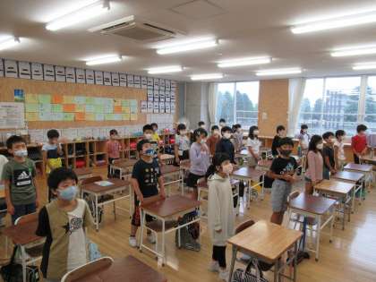 朝の時間に今月の歌「ふるさとの空」を歌っています。マスクを着用したままですが、きれいな歌声を響かせています。富山の四季折々の風景を想像しながら自然に身体が揺れたり、言葉を一つ一つ丁寧に語ったりしている様子から、ふるさとを大切に想う気持ちが伝わってきます。