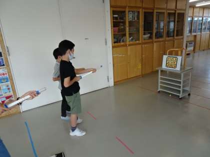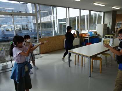 4年生は理科で「閉じ込めた空気と水」の学習をしています。空気鉄砲を使って、的当てを楽しみながら閉じ込めた空気は押されるとどうなるか実験しました。