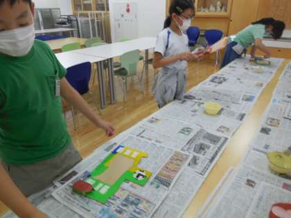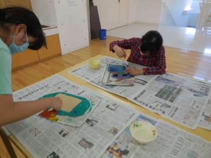 今日は、ホワイトボードにニスをぬりました。あとは、きりで穴を開け、紐を通したら完成です。完成間近に、子供たちもわくわくしています。