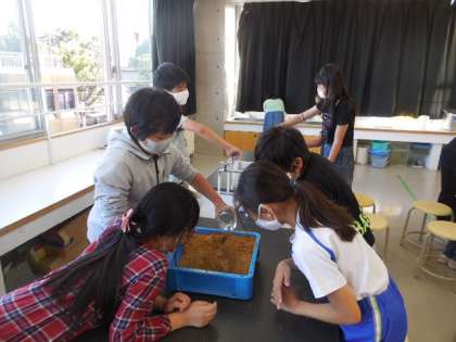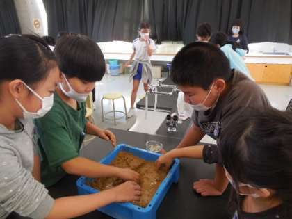 5年生は、理科で「流れる水のはたらき」について学習しています。今日は、土の山を作って水を流し、土のけずられ方を観察しました。