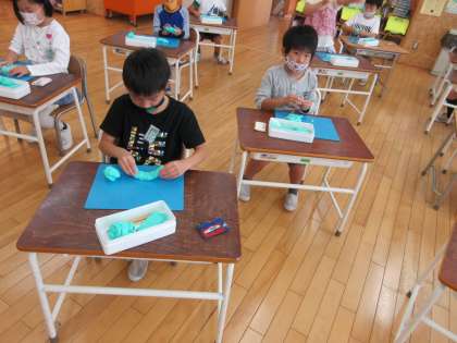 図画工作科の学習では、粘土を使って「ごちそう」を作っています。