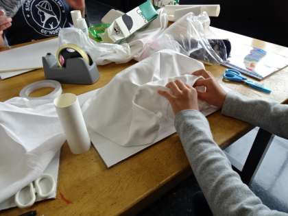 まずは、芯材を組み合わせたり、シーツを試しにかぶせたりしてイメージをふくらませていました。