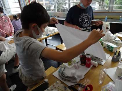4年生は図画工作科で「とろとろ カチコチ 島クリエイト」という学習をしています。子供たちは自分だけの島をつくると聞いて、わくわくしていました。芯材の上に、液体粘度に浸したシーツをかぶせて、それを固めて島をつくります。