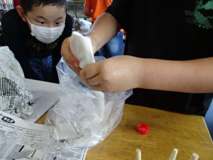 いよいよ、シーツを液体粘土に浸して、芯材にかぶせます。まずは、シーツを水でしっかりと濡らしてからしぼります。次に、液体粘土をかけて、袋の中でしっかりと揉み込みます。むにゅむにゅちとした感覚が気持ちよくて子供たちから歓声が上がっていました。