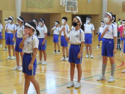 今日は6年生と一緒に応援合戦の練習をしました。てきぱきと指示を出したり、前に立って自ら大きな声で応援したりする団リーダーの姿を見て、6年生はかっこいいなと改めて感じた5年生でした。教室では、「6年生みたいに、しっかりと声を出したい」と振り返る子供が多くいました。
