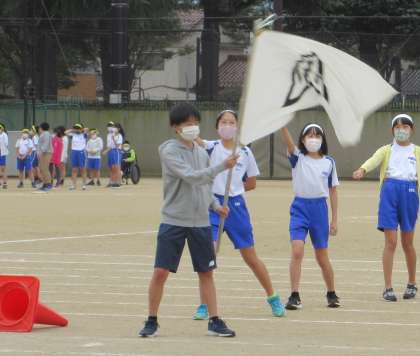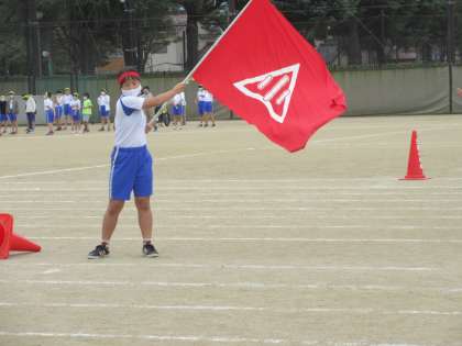 応援練習をがんばっています。応援合戦では旗手が力強く旗を振り、応援をより迫力あるものにしています。