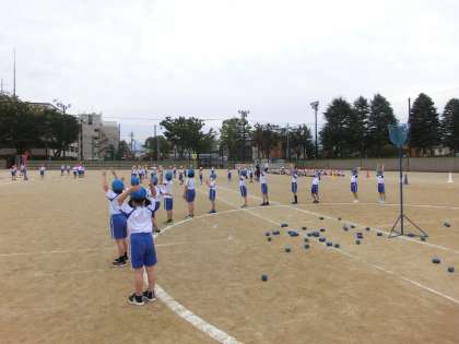 1、2年生合同で玉入れの練習を行いました。整列や入場、場所移動もスムーズになってきました。
