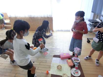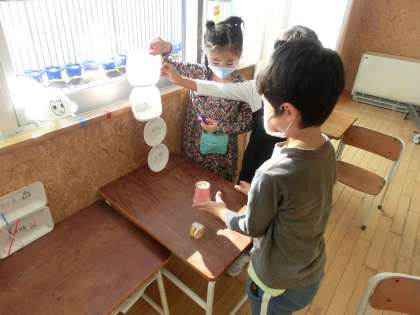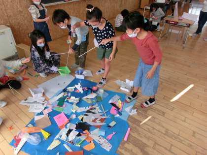 生活科の時間に各学級でつくったおもちゃで交流しました。他の学級の友達に丁寧にルールを説明したり、友達のつくったおもちゃのアイディアに感心し、夢中になって遊んだりするなど、子供たちは生き生きと活動していました。