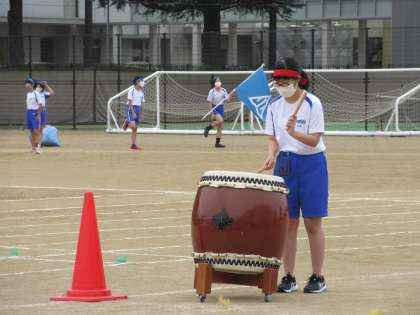 運動会まで、応援の練習も残り少なくなりました。応援合戦では、太鼓で応援を盛り上げています。応援のリズムや力強さを支えています。