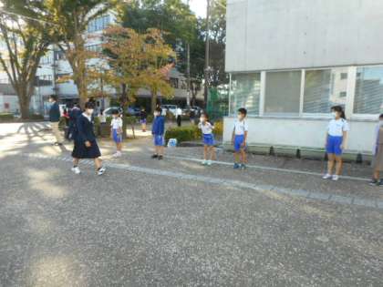各クラスの代表の子供が、芝園中学校のお兄さん、お姉さんと一緒に「秋のさわやかあいさつ運動」に参加しました。気持ちのよい天気の下で、さわやかなあいさつが響いていました。