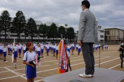 写真は昨年度の優勝旗と応援優勝杯の返還、児童代表の挨拶の様子です。