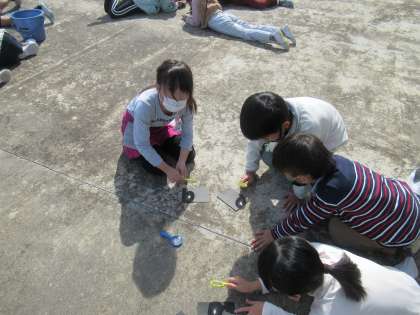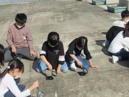 理科の学習で、虫眼鏡で日光を集める実験をしました。虫眼鏡を黒い紙に近づけたり、遠ざけたりして光の集まり方を調節しました。しばらくすると「わあ、紙がこげてきた」と声があがり、日光が集まると熱くなることを実感した子供たちです。
