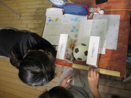 算数科では、円と球の学習をしています。コンパスを使って、円をかいたり長さをうつしとったりする練習をしています。今日は、球の直径を正確に測る方法をマスターするために、辞典と定規を使って実際にボールの直径を計測してみました。実際に計測してみることで、球の直径は球の中心を通ることを意識することができました。
