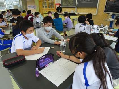 理科室での実験の様子です。水にとけた食塩はどうなったのか、その様子をじっくり観察し、予想を立てました。