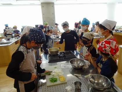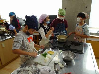 調理実習の様子です。だし担当、切る担当に分かれ、互いに協力しながらおいしい味噌汁を作りました。