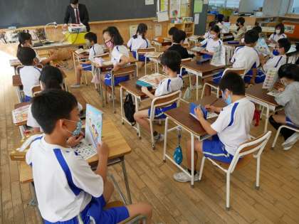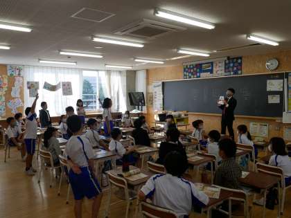 週に1度の外国語活動の時間です。今日は果物の名前を、ゲームをしながら楽しく覚えました。元気に手を挙げ発表したり、発音をしたり、外国語に親しんでいます。