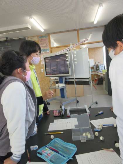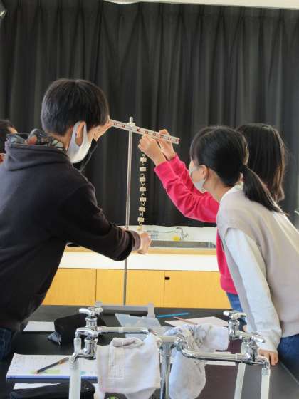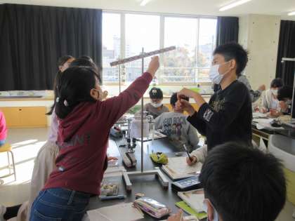 理科の学習では、てこが水平につり合うときの決まりを、実験てこを使って調べました。結果から分かったことが本当に成り立つのか、再度てこを使って調べようとするなど、とても意欲的でした。