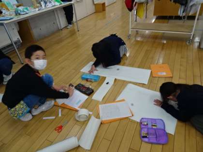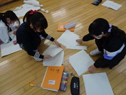 4年生は、総合的な学習の時間に、パラリンピックや身の回りのバリアフリーについて学んできました。それらの学習から、もっと調べたいことを決め、テーマごとにグループで調べ学習をしてきました。今、子供たちは、調べて分かったことを発表しようと、まとめをつくっています。分かりやすく伝えようと、チームで話し合い、生き生きと活動に取り組んでいます。