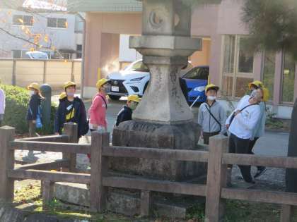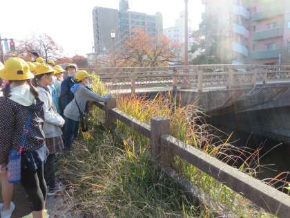 社会科で、昔神通川を渡るための舟橋が、芝園校区にあったことを学習しました。現在でも、当時の面影を残した常夜燈や、当時の舟橋の形をイメージした橋があり、それを見学に行きました。常夜燈の位置を手がかりに、当時の神通川の川幅を歩いてみると、子供たちは「こんなに広かったのか」「ここが全部船の橋だったら大変だ」とつぶやいていました。