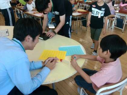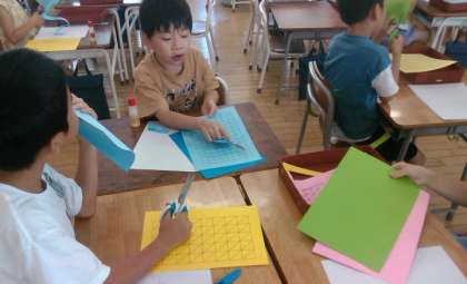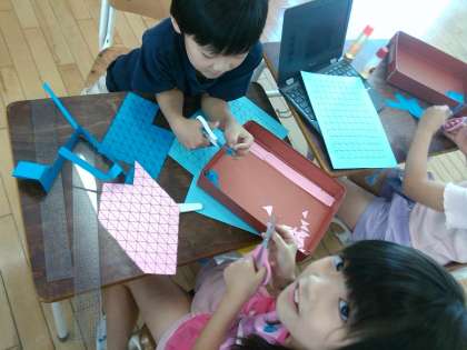 三角形や四角形の特徴や直角等の意味を知り、それを生かして仲間とアート作品づくりに取り組んでいます。うまく、素敵にしきるめるには、どんなやりかたがいいかな・・・・・仲間や先生とお話しながら、楽しく活動しています。