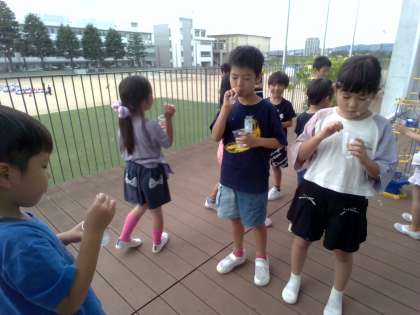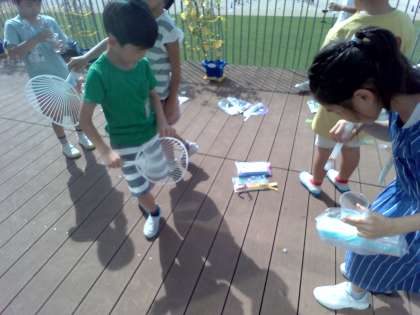 おおきいシャボン玉やたくさんのシャボン玉など、ひとりひとりが作りたいシャボン玉を作ろうと、道具を工夫する姿が見られました。