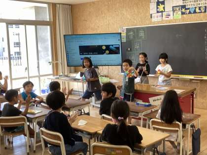 係からのプレゼントで、お誕生日の友達に腕輪を渡しました。バースデーソングも添えてお祝いし、照れくさそうにしながらも喜ぶ姿がありました。