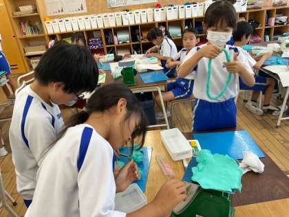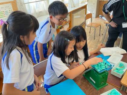 理科で、100gの粘土の形を変えると、重さはどうなるのか予想しながら調べました。重そうな形、軽そうな形を考えながら実感しました。どんな形にしてもほとんど変わらないこと、少し変わったとしたら、手につくなど量と、重さが変わる理由が、あることがわかりました。空気の重さが、気になってこだわって調べる姿も見られました。